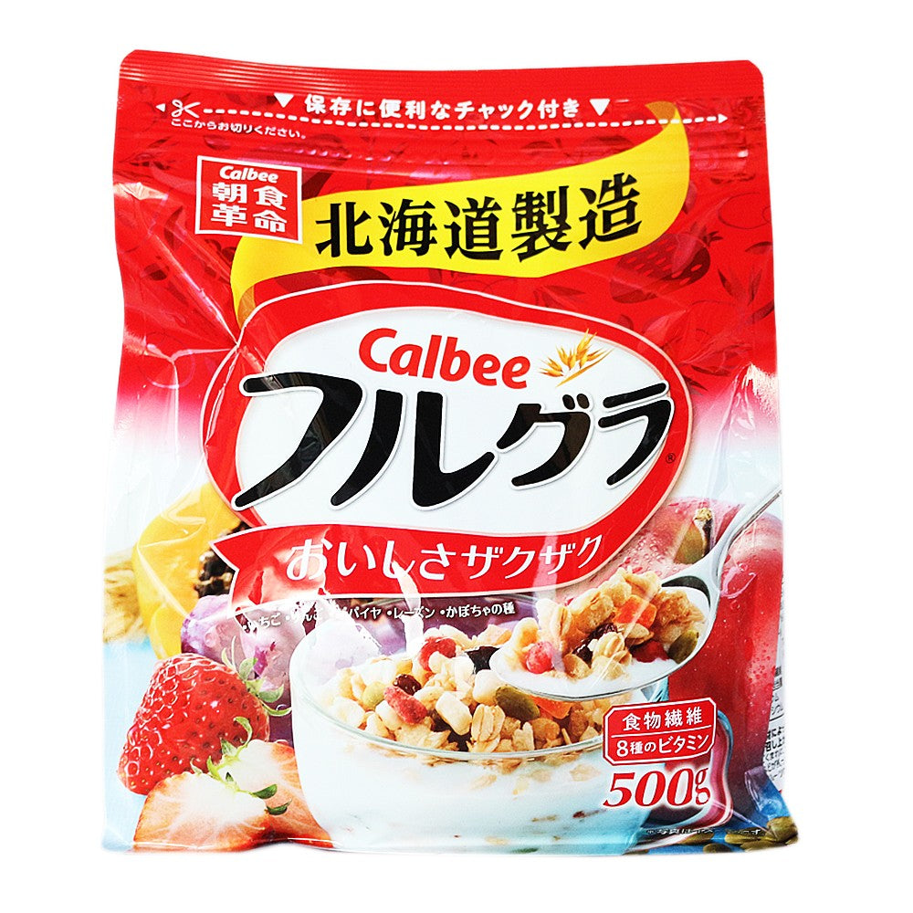 - Japan's No.1 Cereal Brand | Calbee Frugra is a granola made from oats, rye, and other grains to be both delicious to taste and seriously healthy. Enjoy the crispy, crunchy texture of the granola in combination with the several different types of fruit. Best enjoy it with milk/yogurt/ice cream! It's tasty on it's own too, your healthier snacking choice.