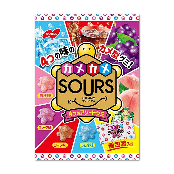 - Gummy candy coated with sour powder for a chewy texture. You can enjoy the taste of four kinds of fruits and drinks, and the appearance and texture of turtle-shaped gummies.