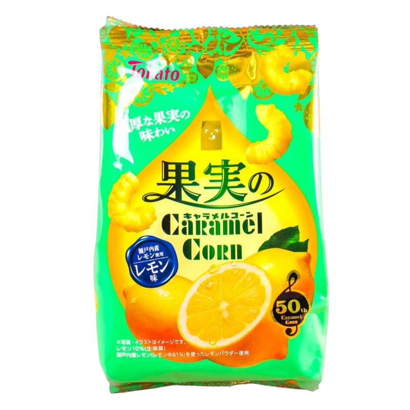 - Enjoy snacking on these fruit-based Caramel Corn puffs with lemon flavor! Lemon juice is used for making the dough and the syrup. Each crunchy piece is also sprinkled with sweet and sour lemon powder!